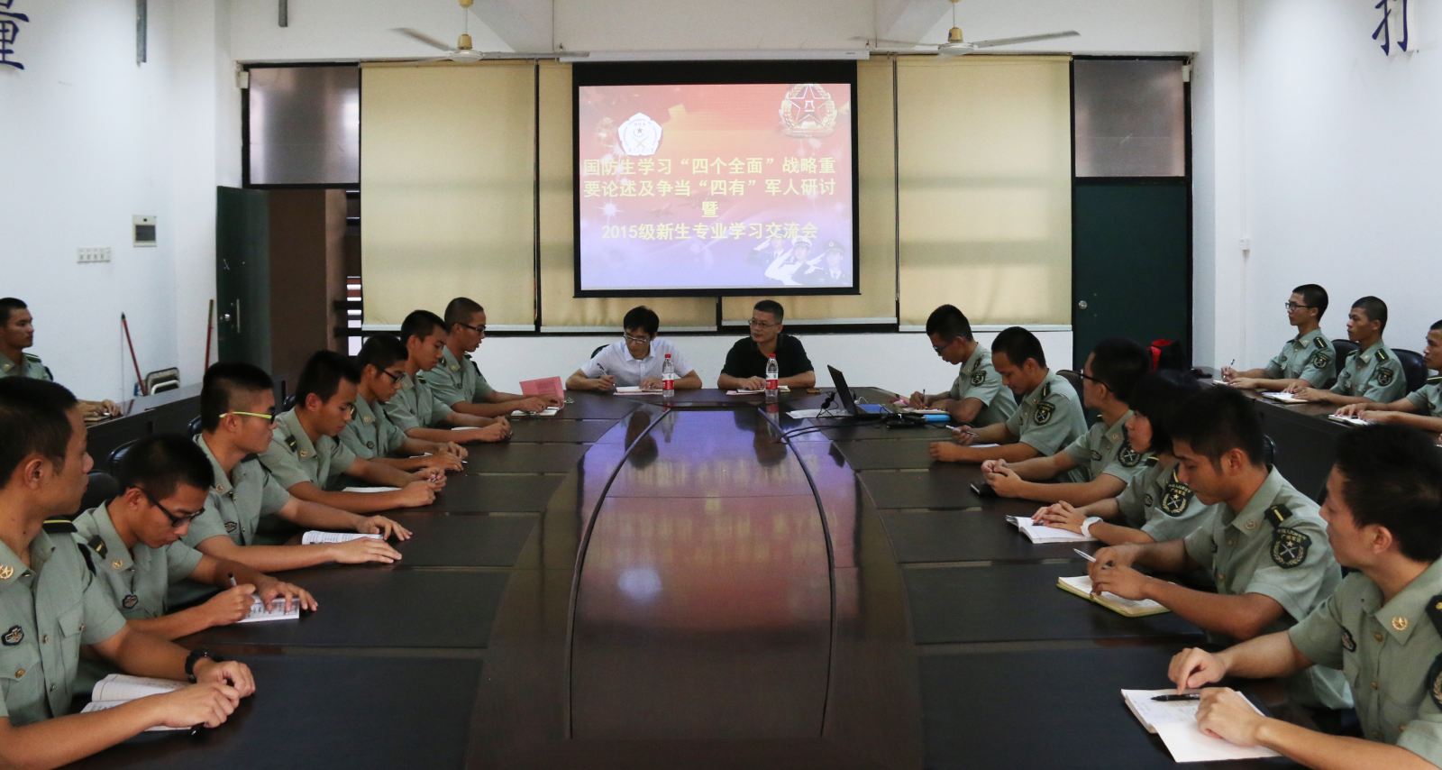 在工学三号馆220会议室举行国防生“四个全面”战略重要论述及其争当新一代“四有”革命军人研讨暨2015级国防生专业学习交流会。院党委苏兆祥副书记,国防生政治辅导员冯树清, 2013、2014级国防生学习尖兵和2015级全体国防生参加此次会议。学院国防生党支部具体组织本次活动。