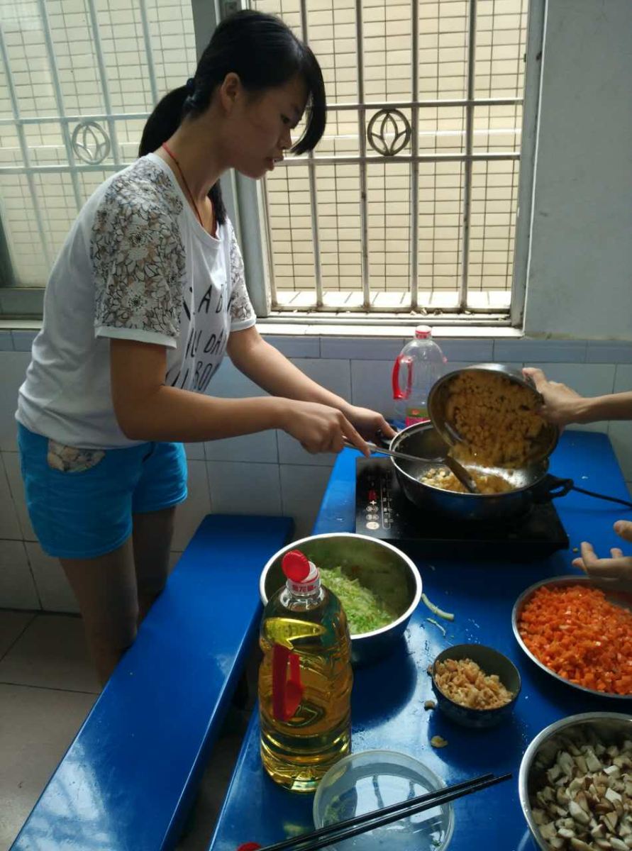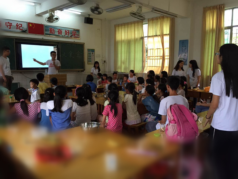 为了准备下午要用的食材,队员们一大清早就冒雨前往小布市场采购,采购回来后队员们纷纷大展身手,为同学们准备可口的甜点,有新鲜的水果拼盘、绿豆糖水、凉粉、奶制甜品等。经过一上午的准备活动在下午2点半开始,学生们带来了从外面购买的、或是自己家里烹饪的各种美食。大食会分两部分,前半部分是美食交流,老师和学生们一起品尝分享各种美味的料理。