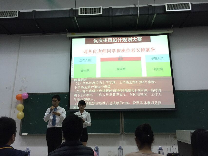 大赛开始,苏兆祥副书记针对班风规划设计重要性作出发言,他强调,一个班级的凝聚力和团队性是一个良好班风的基础。随后,入围班级井然有序地轮流以PPT的形式展示了所在班级的构建规划和展望。此次比赛最大的亮点是紧贴时代脉搏,从党团建设和班级制度方面分析班级的现状,并针对此过程中存在的不足制订了一系列可行的计划,整体表现可圈可点。雷鸣般的掌声在场上思维严谨独到、妙语连珠的主讲人和场下的助力亲友团积极呐喊回应中频频响起。