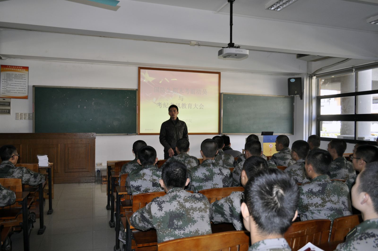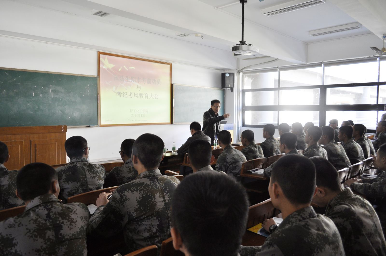 在工学三号馆208室举行全院国防生期末考前动员与考纪考风教育大会。院党委英健文副书记、国防生管理办公室杨小帆副主任、杨刚老师以及国防生辅导员冯树清老师出席本次会议。