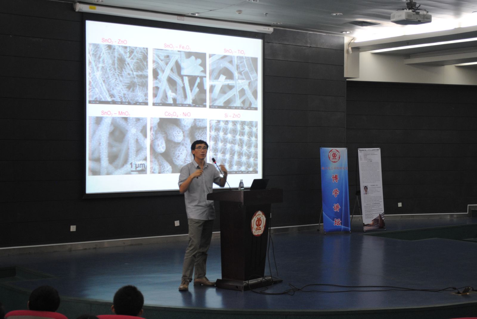 报告会上,范红金教授介绍了他近来的研究成果——“如何应用金属氧化物纳米材料来提高电极的倍率性能与超稳定性。”,围绕“分层和异质核壳或树形结构对各种导电基质材料的构建策略”问题,提出构建纳米线,纳米管阵列等对策,指出所得金属氧化物、氢氧化物和硫化物具有短电子流路径、高比表面积和功能协同作用等特点。范红金教授的报告以图形展现数据、以数据分析前沿,讲解幽默风趣,又不乏学术的严谨性,赢得了听众阵阵热烈掌声。互动环节,同学们踊跃提问,范红金教授一一做了解答。