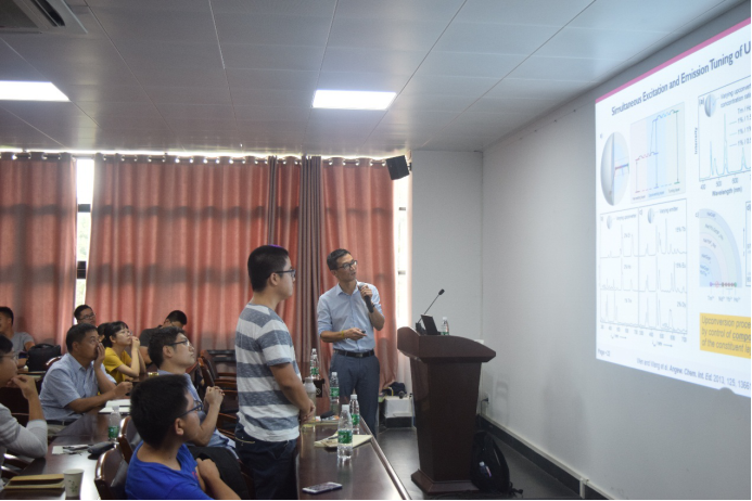 王锋博士作了题为“Controlling lanthanide Luminescencein core-shell nanoparticles” 的学术报告。报告分为五大模块,首先通过与其他发光材料对比,阐释了为什么致力于研究镧系掺杂上转换纳米发光材料及其相关应用,并指出了其目前面临的主要难题。紧接着以自己课题组所做的相关工作为例子,深入浅出地介绍了镧系掺杂上转换纳米晶及其层层生长成核-壳结构纳米颗粒的制备方法及相应的表征。随后以NaGdF4:Yb,Tm@NaGdF4:X(X=Tb, Eu,Dy, Sm)、NaGdF4:Ce@NaGdF4:Nd@NaYF4等为例,详细介绍了通过核-壳结构进行不同壳层镧系离子的掺杂,从而实现层与层之间的能量传递,进而调控纳米颗粒内部的激发和发射光谱。接着介绍了通过控制核-壳结构不同层之间的离子浓度及壳层厚度,进而控制离子之间的距离而促进能量传递,并利用在颗粒最外层包覆惰性层的方法来抑制能量损失,最终实现增强镧系掺杂上转换纳米颗粒发光的目的。最后,王锋博士总结说明了镧系离子掺杂的核-壳结构纳米颗粒对光子上转换及其光谱调控、荧光增强的重要意义。整场报告内容丰富多彩,学术探讨氛围浓烈,深受与会师生的一致好评。